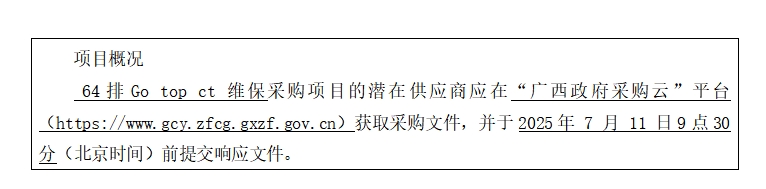 簡要規(guī)格描述或項(xiàng)目基本概況介紹、用途:64排Go top ct 維保1項(xiàng)。如需進(jìn)一步了解詳細(xì)內(nèi)容,詳見競爭性磋商文件。