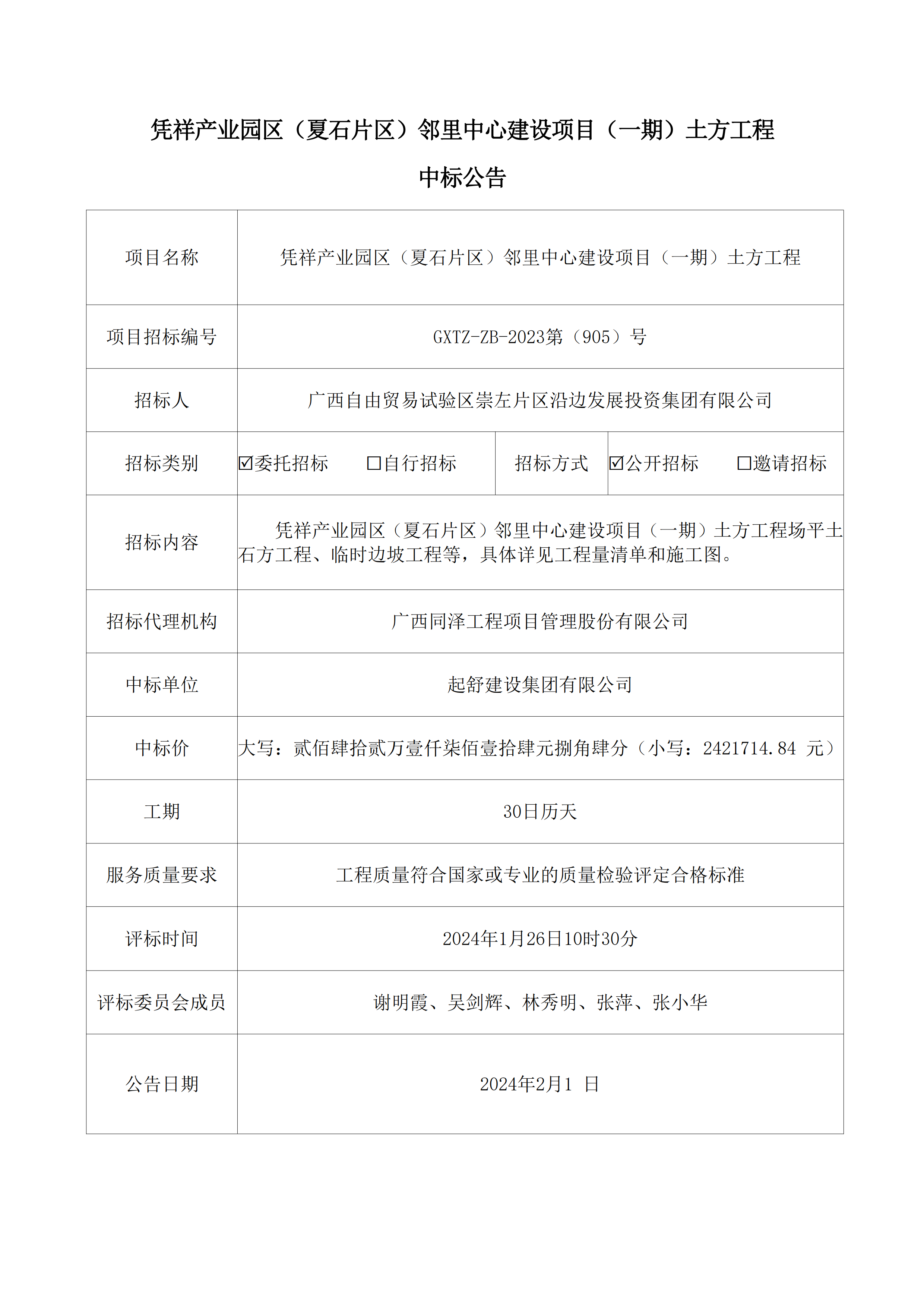 憑祥產業園區(夏石片區)鄰里中心建設項目(一期)土方工程中標公告